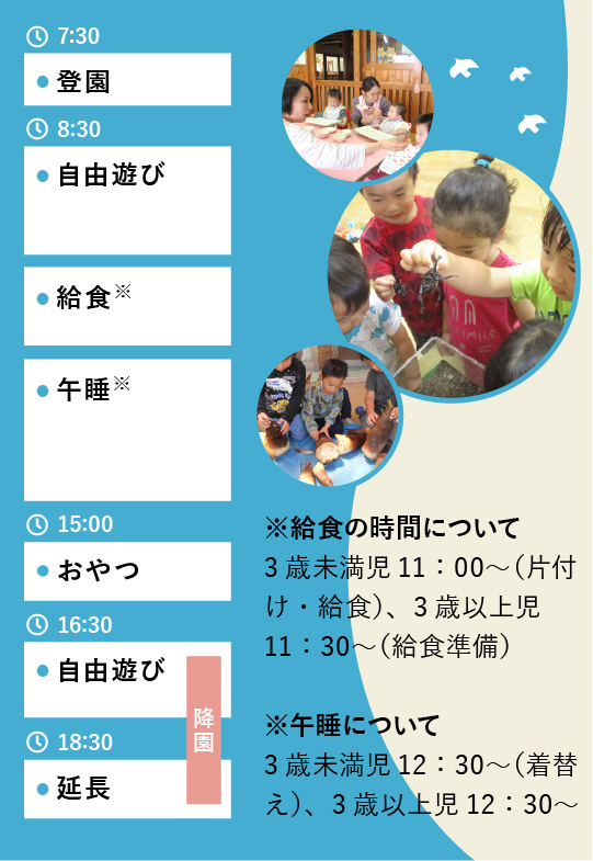 | 延長保育 | 平日のみ 18:30~19:00 |